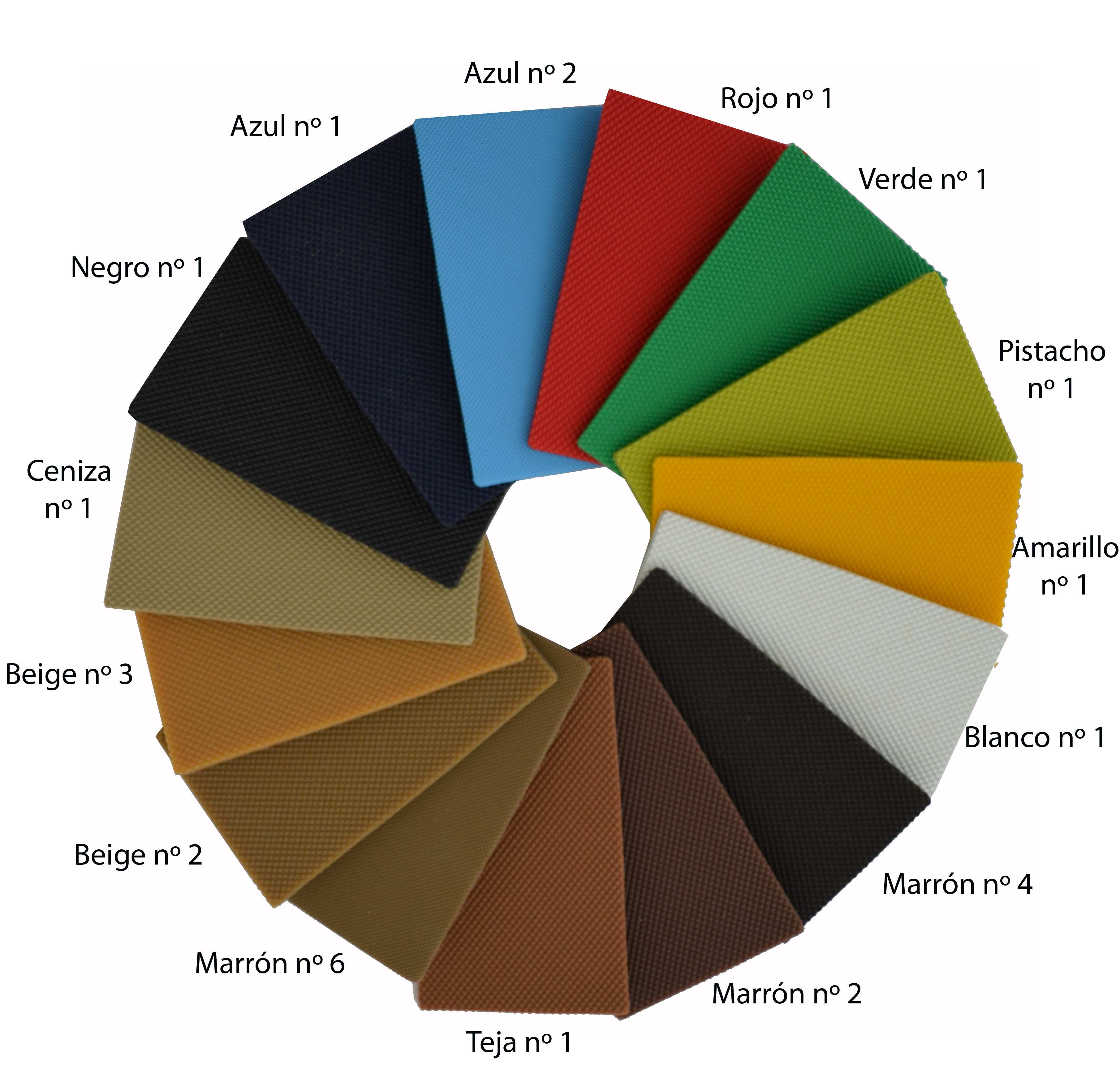Azul nº1, azul nº2, rojo, pistacho, amarillo, blanco, marrón nº6. marrón nº4, marrón nº2, Teja, Beige nº2, Beige nº3, Ceniza, Negro